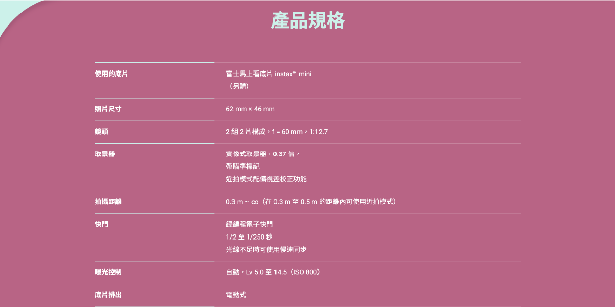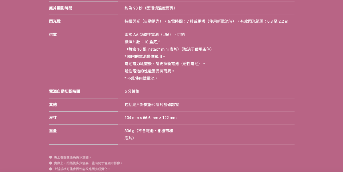 供電:兩節 AA 型鹼性電池(LR6),可拍攝照片數:10 盒底片