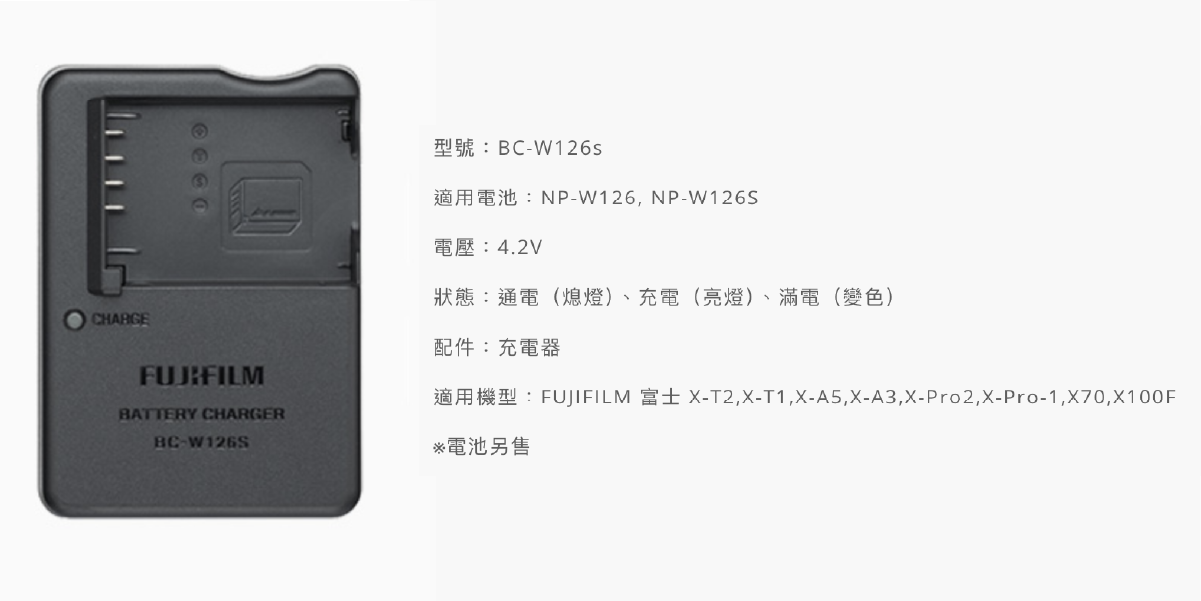 【BC-W126S充電器】適用於NP-W126S電池 (FUJIFILM X系列數位相機)
